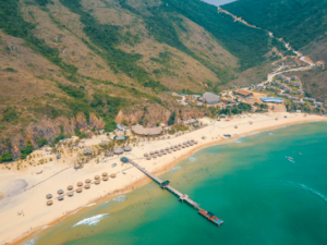 09h30: Đến nơi, Quý khách hòa mình vào thiên nhiên, một bên là biển nước màu xanh lam trong vắt, một bên là núi đá cao sừng sững. Khám phá bãi cát dài mịn, khung cảnh hoang sơ đầy quyến rũ, đặc biệt được chấm phá bằng những công trình đặc sắc như Cầu Yến, Cầu Trái Tim, Kỳ Co Resort,… và những hang đá, suối nước đẹp đến bất ngờ.